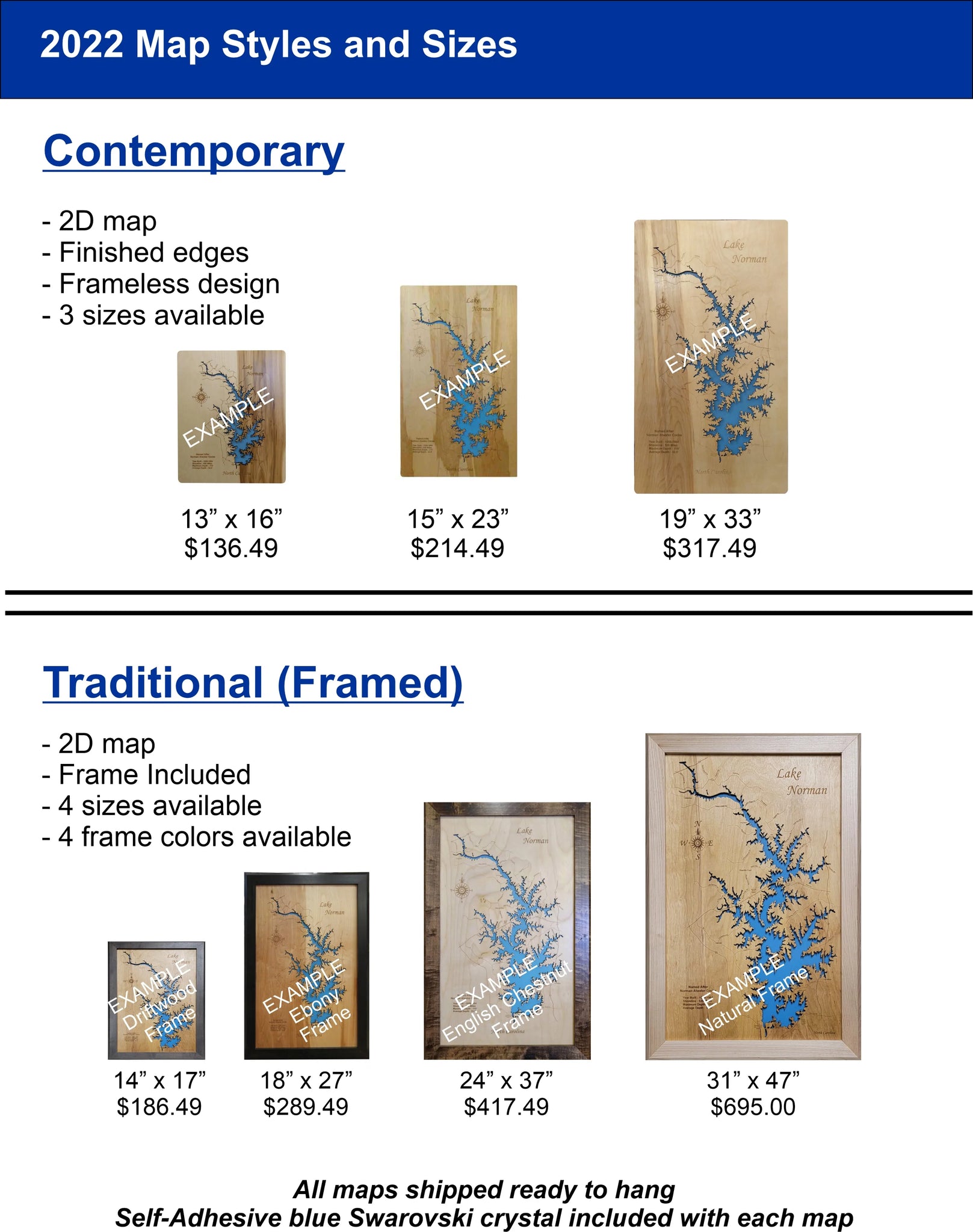 - Lake Name, Compass Rose and points of interest laser engraved into the map face