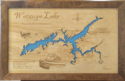 This is a beautiful, detailed, laser engraved and precision cut map, including lake information such as surface area, elevation and maximum depth.