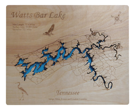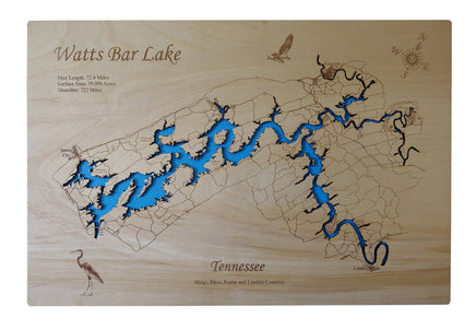 This is a beautiful, detailed, laser engraved and precision cut map, including lake information such as surface area, elevation and maximum depth.