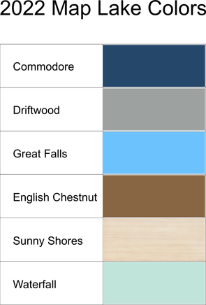 - Water Colors: Commodore, Driftwood, English Chestnut, Great Falls, Sunny Shores, Waterfall