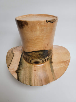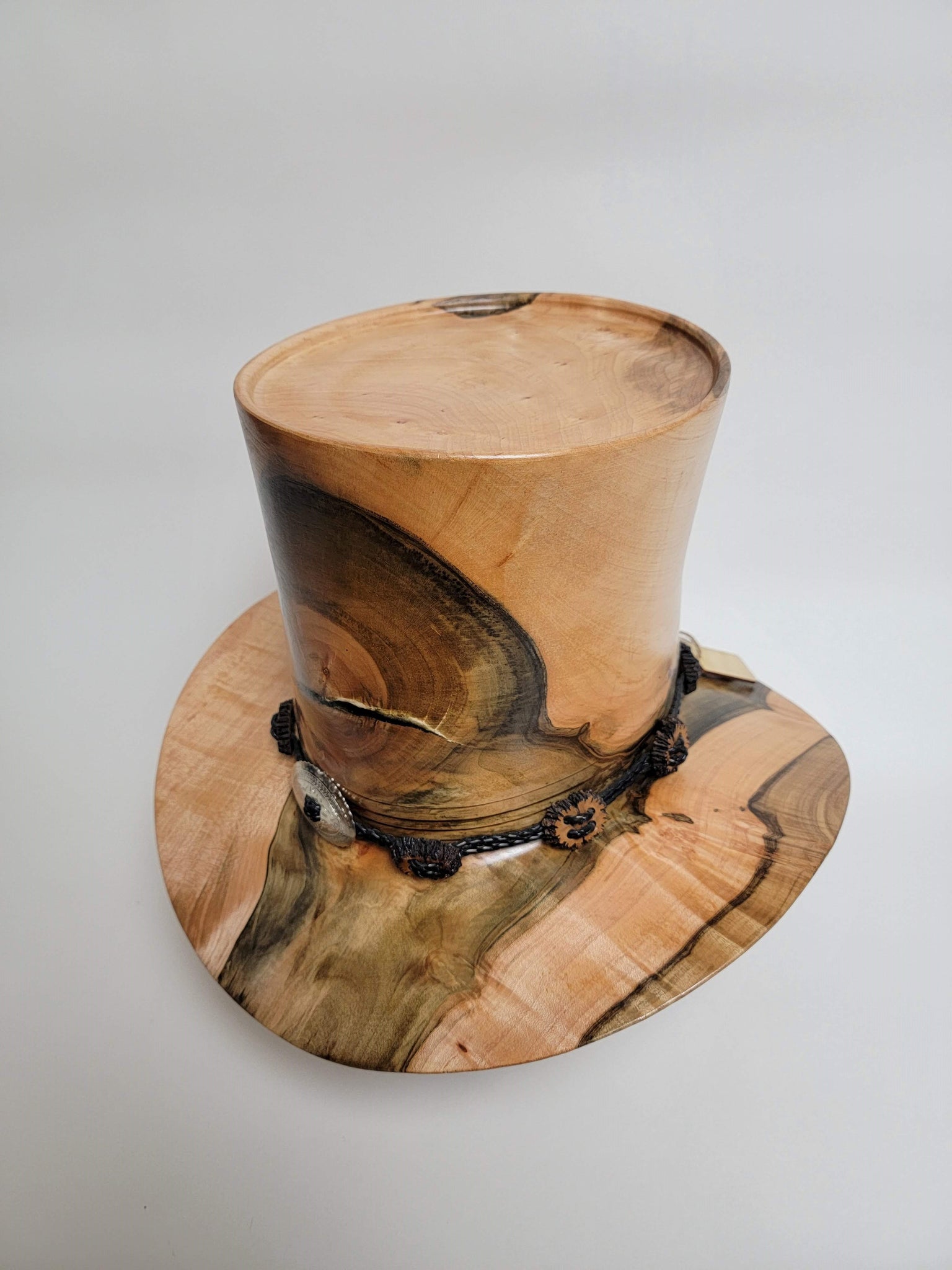 Beautiful wood-turned hat made from Maple. The knot in the front of the hat gives this piece even more character! Make a fashion statement in this unique hat!
