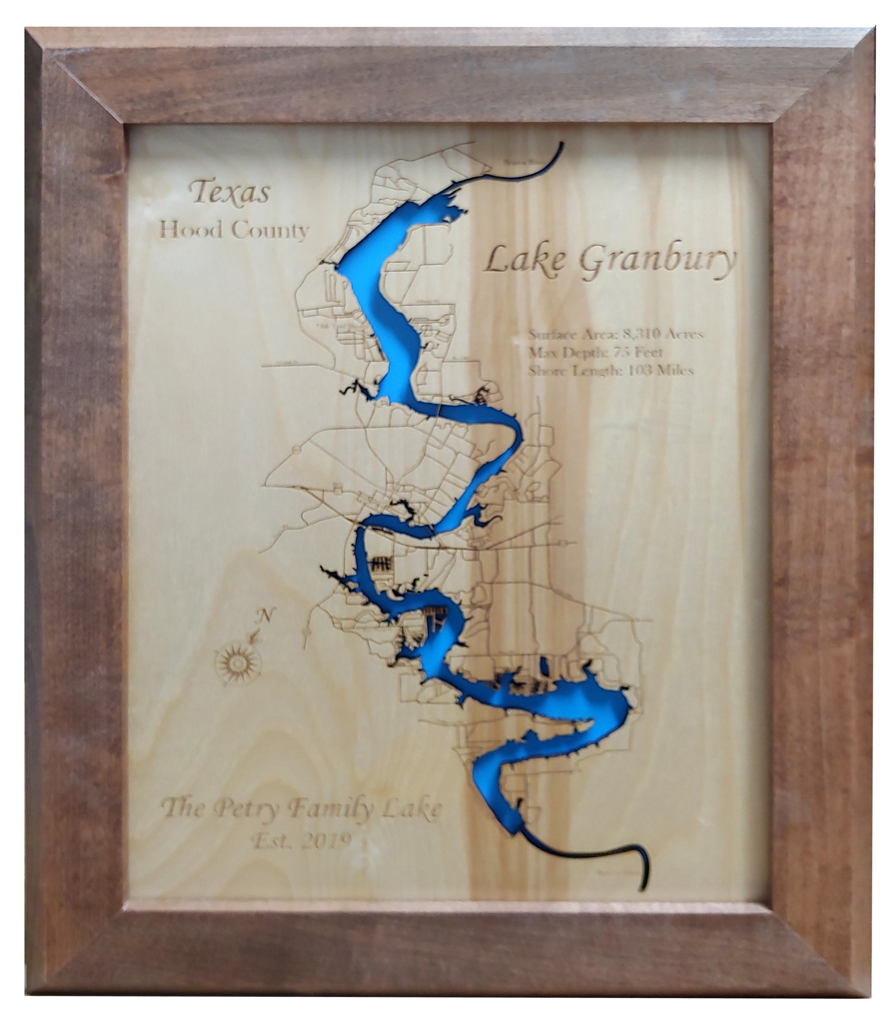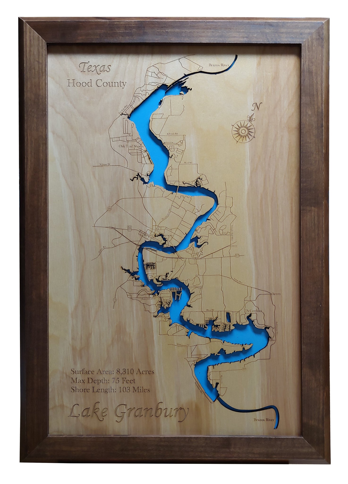 This is a beautiful, detailed, laser engraved and precision cut map, including lake information such as surface area, elevation and maximum depth.