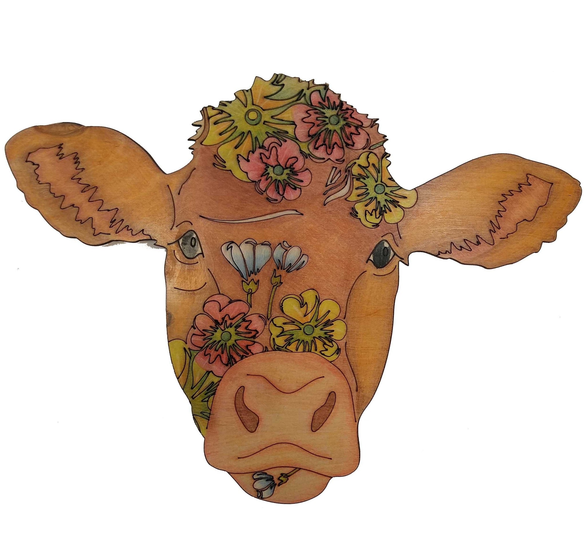 This wood cow kit includes a wood cutout (approximately 12" wide) with coloring guidelines lightly engraved into the wood to help you along the way. You will also receive a wood keyhole hanger and spacer that can be easily attached with double-sided tape, provided. These give the piece a "floating" stand-out effect when hung on the wall.